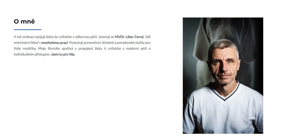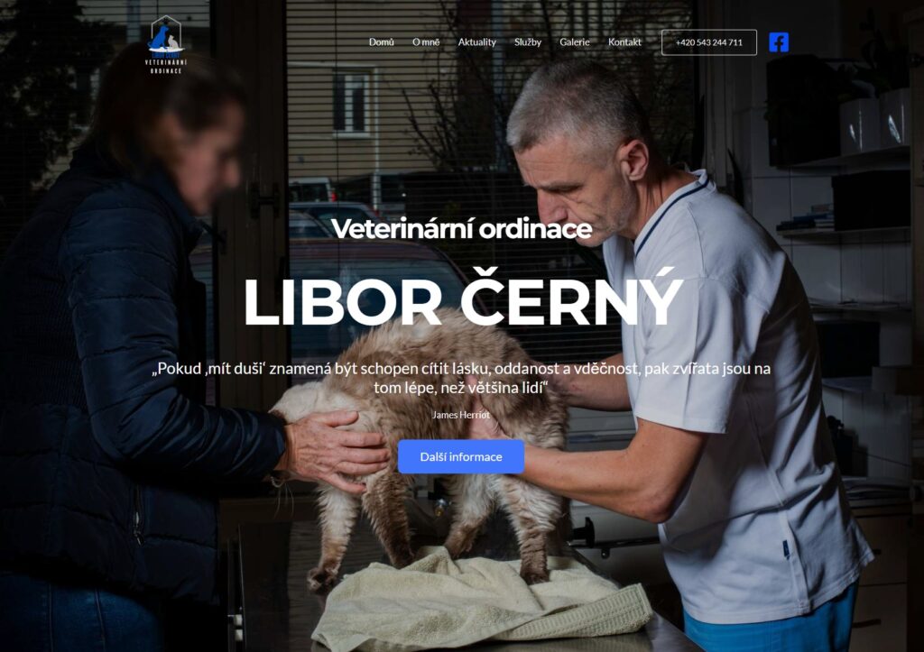 MVDr. Libor Černý je zkušený veterinář s ordinací v Brně, který se specializuje na komplexní péči o malá zvířata. Kromě odborného přístupu klade důraz na osobní kontakt se zvířaty i jejich majiteli. Nový web měl tyto hodnoty od začátku odrážet – být přehledný, srozumitelný, důvěryhodný a snadno použitelný na jakémkoli zařízení.