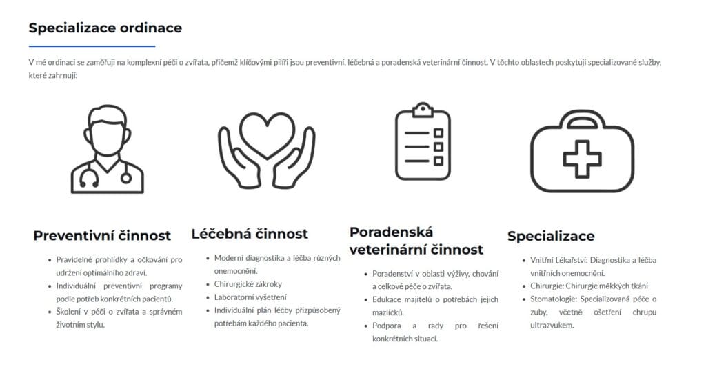 Na začátku jsme si s MVDr. Liborem Černým sedli a probrali, co přesně od nového webu očekává. Řešili jsme cílovou skupinu, typ klientely i to, jaké emoce by měl web vyvolávat. Základem bylo vytvořit přehledné a důvěryhodné prostředí pro stávající i nové klienty.